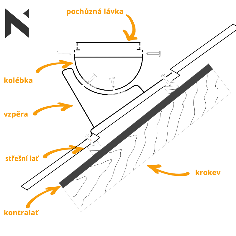 Držák komínové lávky – je určen k montáži na střechy zakryté plechovou střešní krytinou. Je to nosný prvek komínové lávky nebo střešního nášlapu. Držák se upevňuje přímo na plechovou střešní krytinu přes lať do krokve. Upevňovací vruty ø8 je nutné zvolit tak, aby jejich délka značně překračovala tloušťku latě. S ohledem na porušení těsnění střešní krytiny je nutné používat vruty s těsnicí podložkou a montážní otvory dodatečně utěsnit asfaltovou hmotou, silikonem nebo jiným těsnicím přípravkem. Držáky lávky je nutné montovat ve vzdálenosti minimálně 800 mm a u každého případného spoje roštů komínových lávek pomocí spojek.